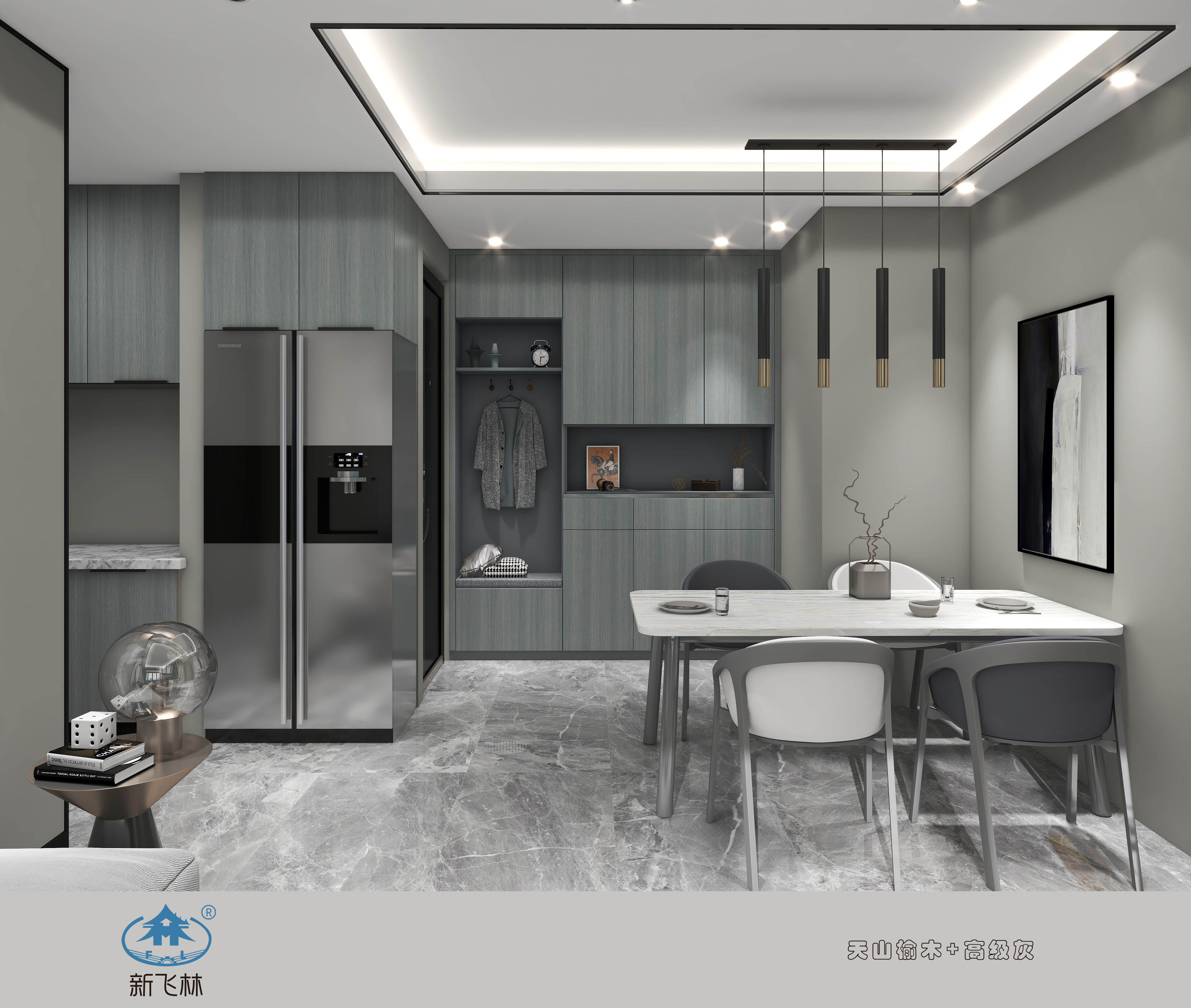 生產(chǎn)過程中嚴格剔除原料中混有的金屬、沙粒、塑料、橡膠、樹皮等雜質(zhì),通過各個生產(chǎn)環(huán)節(jié)的嚴格把控、超低摩爾比膠黏劑的應(yīng)用和熱壓周期的嚴格控制,最終生產(chǎn)出合格的飛林F★★★★飾面刨花板。